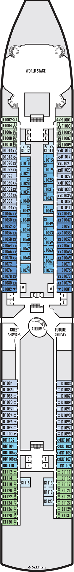 | Fully obstructed view |  | Partial sea view |  | Quad (2 lower beds, 1 sofa bed, 1 upper) |  | Shower only |  | Single sink vanity |  | Staterooms have solid steel verandah railings instead of clear-view plexiglass railings |  | Staterooms VA8032, VA8031, VA6049, VA5140, VA5137, VA5054, VA5051, VA4132, VA4131, H4090, H4089, VA4052, and VA4051 are ambulatory accessible, roll-in shower only |  | Suites SC6175 and SC6164 are fully accessible, bathtub and roll-in shower; Suite SS6108 and staterooms I8037, VB6004, VB6003, D1100, C1082, C1081, J1074, K1012, and K1011 are fully accessible, roll-in shower only |  | Suites SY8068, SY5002, and SY5001 are fully accessible with single side approach to the bed, bathtub, and roll-in shower |  | Triple (2 lower beds, 1 sofa bed) |