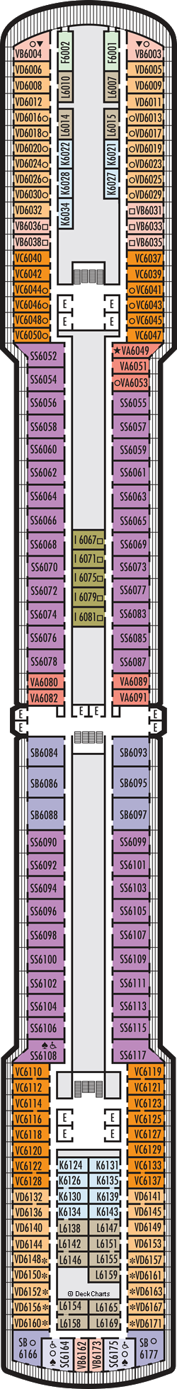 Suites SC6175 and SC6164 are fully accessible, bathtub and roll-in shower; Suite SS6108 and staterooms I8037, VB6004, VB6003, D1100, C1082, C1081, J1074, K1012, and K1011 are fully accessible, roll-in shower only