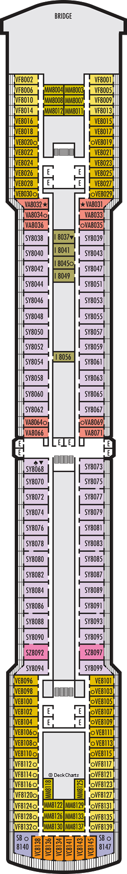 | Fully obstructed view |  | Partial sea view |  | Quad (2 lower beds, 1 sofa bed, 1 upper) |  | Shower only |  | Single sink vanity |  | Staterooms have solid steel verandah railings instead of clear-view plexiglass railings |  | Staterooms VA8032, VA8031, VA6049, VA5140, VA5137, VA5054, VA5051, VA4132, VA4131, H4090, H4089, VA4052, and VA4051 are ambulatory accessible, roll-in shower only |  | Suites SC6175 and SC6164 are fully accessible, bathtub and roll-in shower; Suite SS6108 and staterooms I8037, VB6004, VB6003, D1100, C1082, C1081, J1074, K1012, and K1011 are fully accessible, roll-in shower only |  | Suites SY8068, SY5002, and SY5001 are fully accessible with single side approach to the bed, bathtub, and roll-in shower |  | Triple (2 lower beds, 1 sofa bed) |