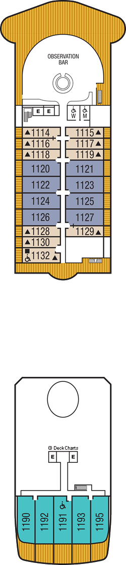 Veranda railings are part metal and part glass; the forward half of the railing is metal and aft half is glass with teak rail