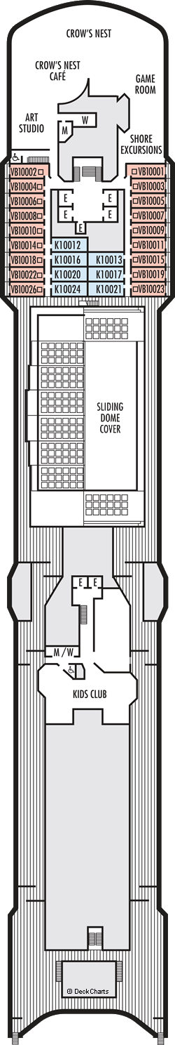Suites SC6175 and SC6164 are fully accessible, bathtub and roll-in shower; Suite SS6108 and staterooms I8037, VB6004, VB6003, D1100, C1082, C1081, J1074, K1012, and K1011 are fully accessible, roll-in shower only